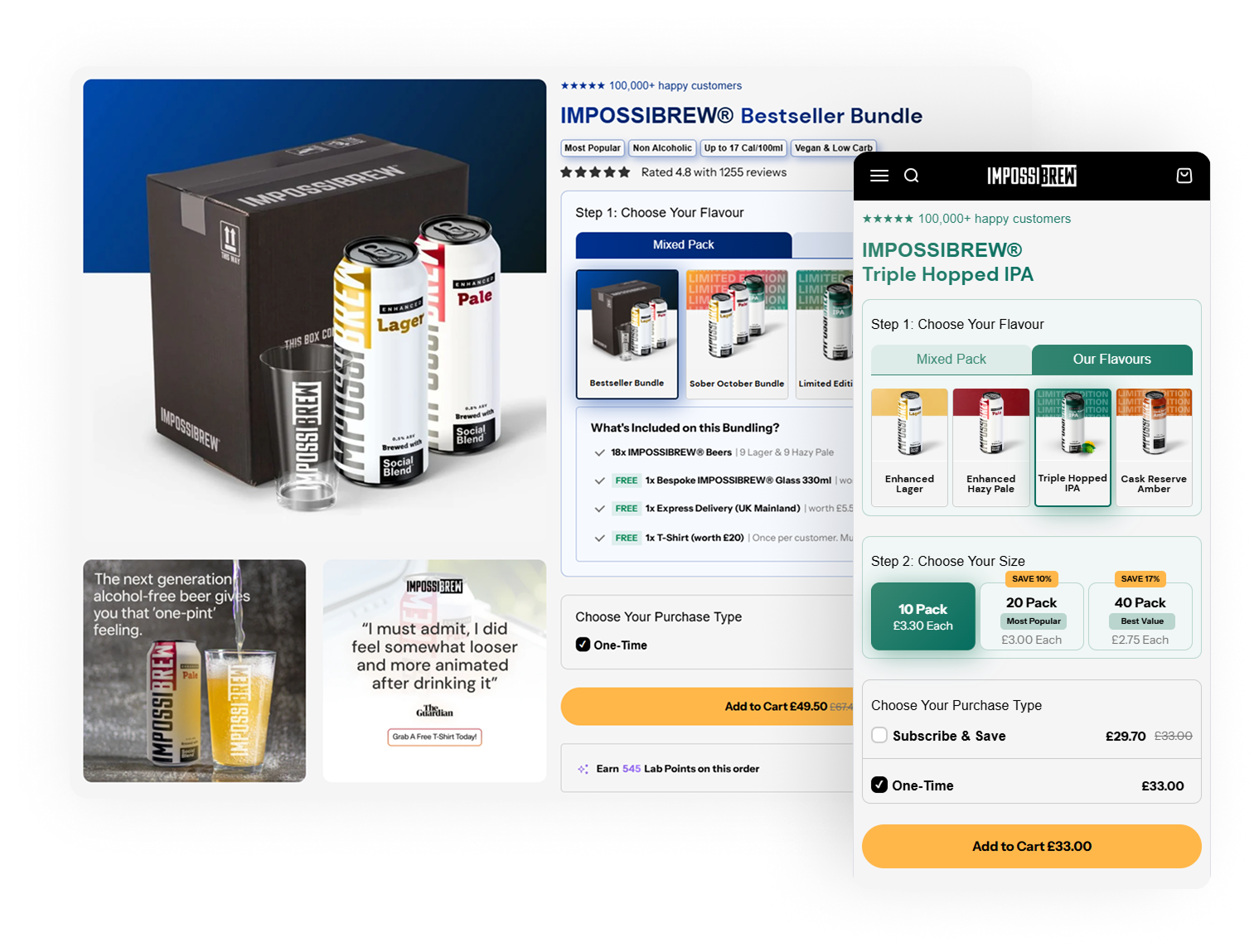 As Impossibrew expanded its product range — introducing multiple flavors, bundles, pack sizes, and subscription options — its purchase flow became fragmented. Customers were navigating several product pages, each with different layouts, offers, and calls-to-action. This resulted in difficulty comparing product types, sizes, and subscription benefits. A heavy maintenance with updates needing to be made across multiple templates.
