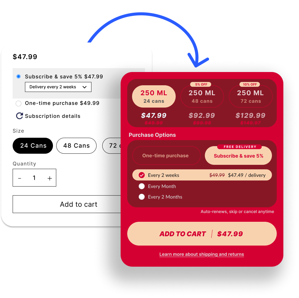 Make subscriptions the clear and convenient choice at every touchpoint—boost sign-ups, increase order value with personalized upsells and bundles, and turn one-time buyers into loyal subscribers.
